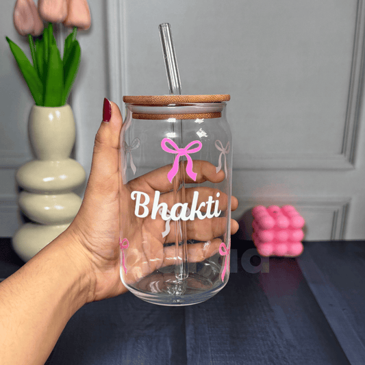 Personalized Cute Sipper 540ml | Pookie Round Glass Tumbler with lid and straw