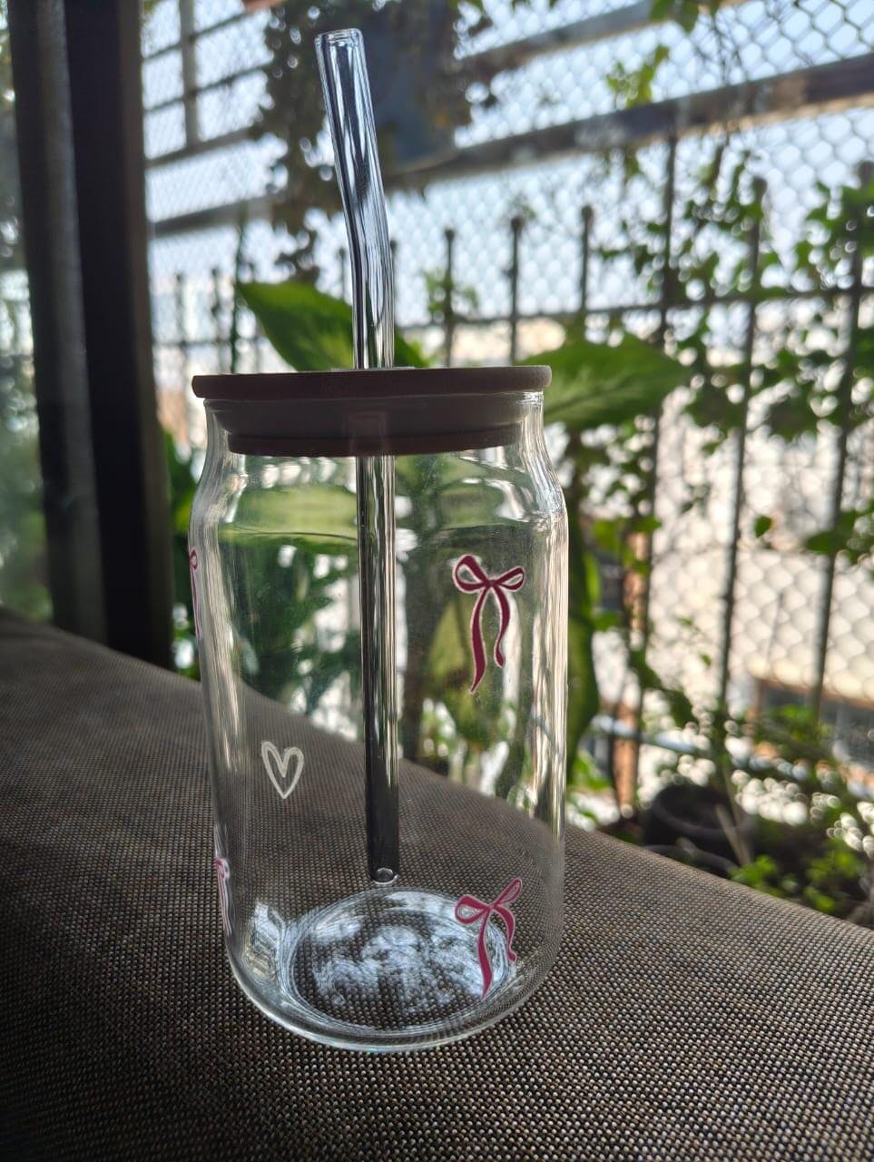Bow tumbler 540ml | 16oz round Glass Tumbler with lid and straw